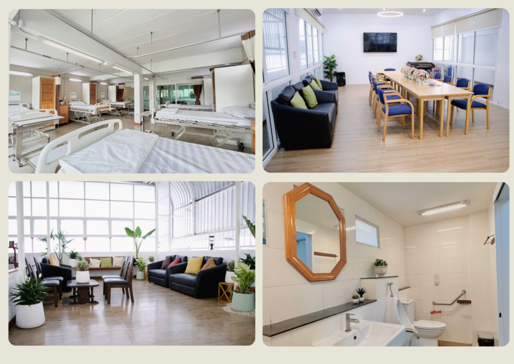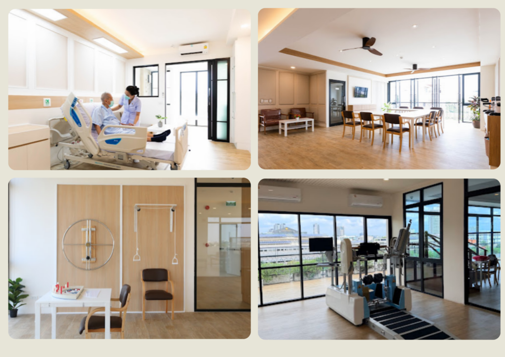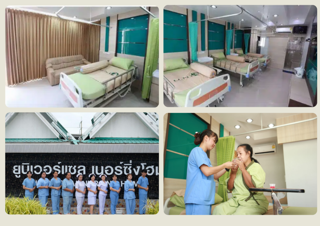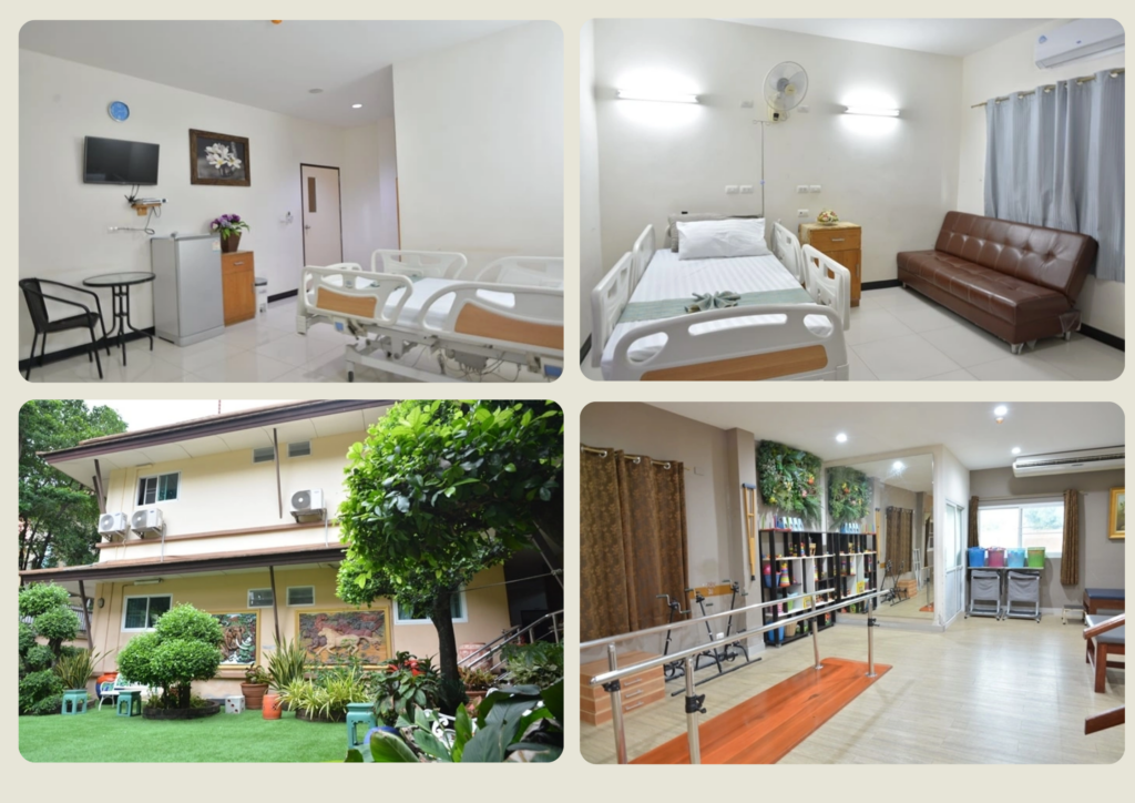 Universal Nursing Home | Near Airport & Major Highways | Supported (24/7 trained caregivers) | PT up to 3x/week, Thai massage, meditation | VIP Single, Double, Multi-bed | Direct hospital link, oxygen machines, air beds |